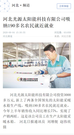 新華社報道說:“河北光源太陽能科技有限公司投資3000多萬元,新上了兩條全國領(lǐng)先的太陽能采暖水箱生產(chǎn)線,吸納190多名農(nóng)民就近就業(yè),今年上半年銷售收入同比增長77%,實現(xiàn)了產(chǎn)銷兩旺?!?/span>