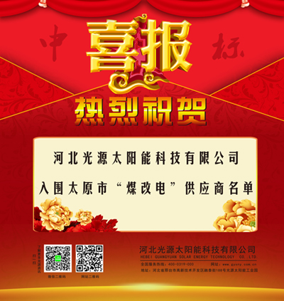 根據(jù)太原市工業(yè)和信息化局農(nóng)村清潔供熱“煤改電”領(lǐng)導(dǎo)小組辦公室制定的《太原市農(nóng)村清潔供熱“煤改電”電采暖設(shè)備供貨及安裝企業(yè)潛在投標(biāo)入圍資格一般要求和技術(shù)標(biāo)準(zhǔn)》(試行),經(jīng)專家委員會(huì)評(píng)審,確定河北光源太陽(yáng)能科技有限公司為2019年山西太原市“煤改電”采暖設(shè)備入圍企業(yè)。入圍產(chǎn)品為:蓄熱式電鍋爐、蓄熱式電暖器。