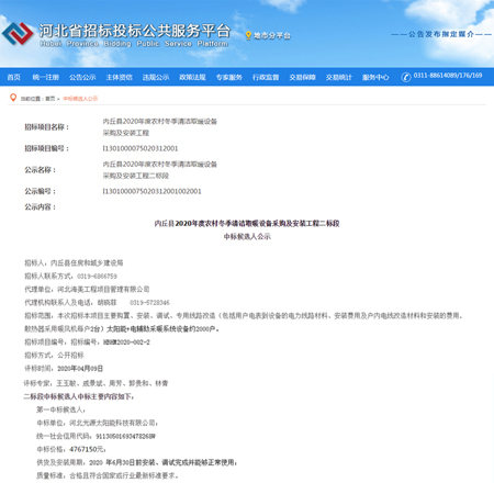 在抗疫的關(guān)鍵時(shí)期,復(fù)工復(fù)產(chǎn)正在如火如荼的進(jìn)行,沒(méi)有什么能比一份中標(biāo)通知書(shū)更能振奮人心了。在營(yíng)銷(xiāo)工作舉步艱難的特殊時(shí)期,河北光源太陽(yáng)能科技有限公司,中標(biāo)內(nèi)丘縣2020年度農(nóng)村冬季清潔取暖設(shè)備采購(gòu)及安裝工程,為我公司2020年度輝煌的經(jīng)營(yíng)業(yè)績(jī)?cè)偬頋饽夭实囊还P。