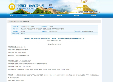 捷報(bào)頻傳, 熱烈祝賀我公司(河北光源太陽能科技有限公司)2019年08月22日中標(biāo)隆堯縣2019年第三批氣代煤(燃?xì)獗趻鞝t、報(bào)警器、波紋管)設(shè)備采購及安裝入圍項(xiàng)目。本次中標(biāo)又一次認(rèn)可了我公司的產(chǎn)品質(zhì)量,驗(yàn)證了我公司的實(shí)力。